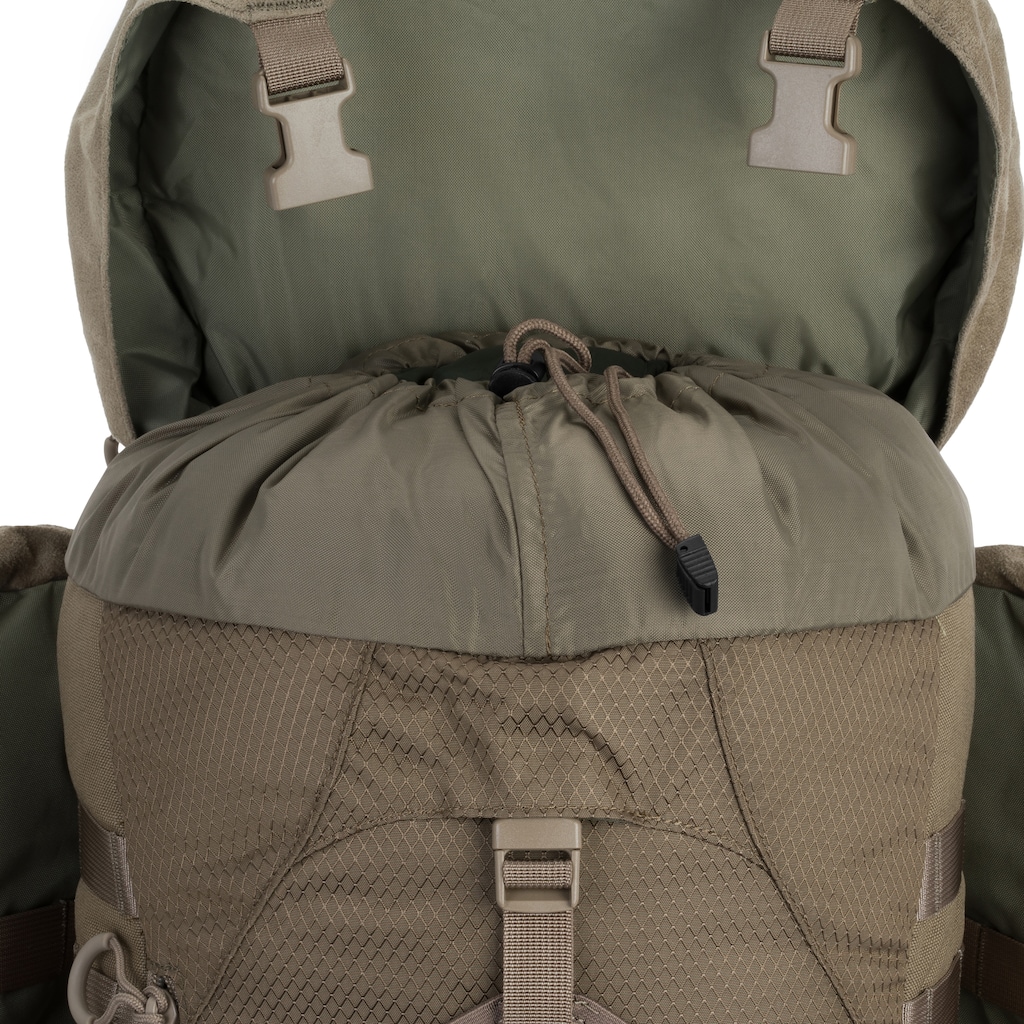 Рюкзак місткістю 40,2 літра, виготовлений з міцної мікрозамшевої шкіри, просоченої водонепроникним покриттям DWR. Він оснащений алюмінієвим каркасом Intex, який забезпечує стабільне перенесення важкого спорядження, зберігаючи при цьому комфорт використання. Розширена система MOLLE/PALS та компресійні ремені дозволяють прикріплювати додаткове спорядження.