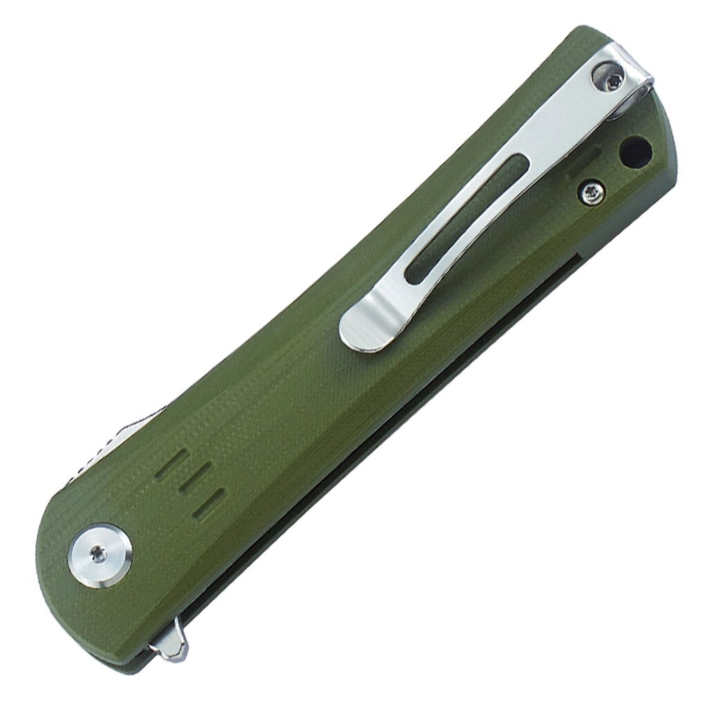 Облицювання рукоятки виконано з ламінату G10 оливкового кольору, створеного з шарів скловолокна, зануреного в епоксидну смолу. Неслизька текстура облицювання та рифлення в місці опори вказівного пальця гарантують надійний хват. Ніж оснащений пружинною сталевою кліпсою, а на кінці рукоятки є отвір для мотузки/ремінця.
