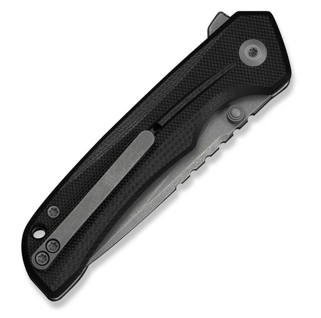Зручне носіння інструменту забезпечує пружна кліпса, виготовлена із стійкого до пошкоджень титану 6AL4V. Конструкція дозволяє кріпити кліпсу з правого або лівого боку у положенні tip-up. На кінці рукоятки розташований отвір, через який можна протягнути шнурок або ремінець, що захищає ніж від втрати.