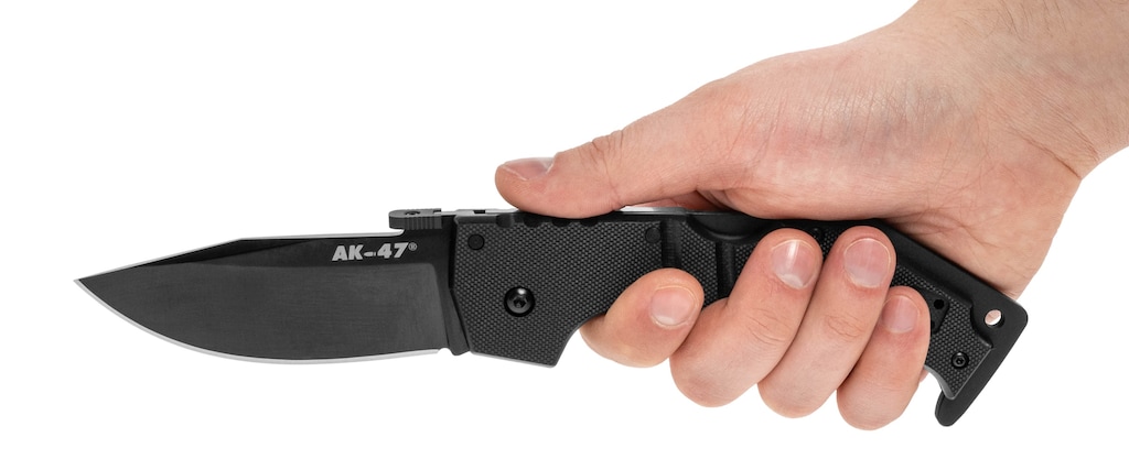 AK-47 тримається ближче до кінця руків’я, ніж до початку, тож частина руків’я дає більший радіус. Відкривається плавно, без проблем відкривається сам при витягу з кишені. G-10 чудово тримається. Найбільший плюс: увігнутий спуск, дуже гостра ріжуча кромка, ідеальна для точного різання. Довжина клинка схожа на таку у Spyderco Military, але конструкція вістря та всього ножа значно міцніша.