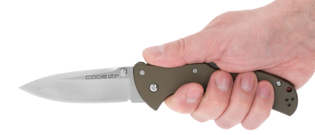 Ергономічно сформована ручка виготовлена з двох алюмінієвих пластин, анодованих у колір Gun Metal Grey. Форма рукоятки запобігає зісковзуванню руки на лезо. Надійність захоплення підвищує насічка під великий палець на обусі рукоятки. Зручне повсякденне носіння забезпечує переставний пружинний кліпс на рукоятці, що дозволяє зачепити ніж за кромку кишені або елементи спорядження. Крім того, модель Code 4 має на задній частині рукоятки отвір, через який можна протягнути шнур для захисту від втрати.