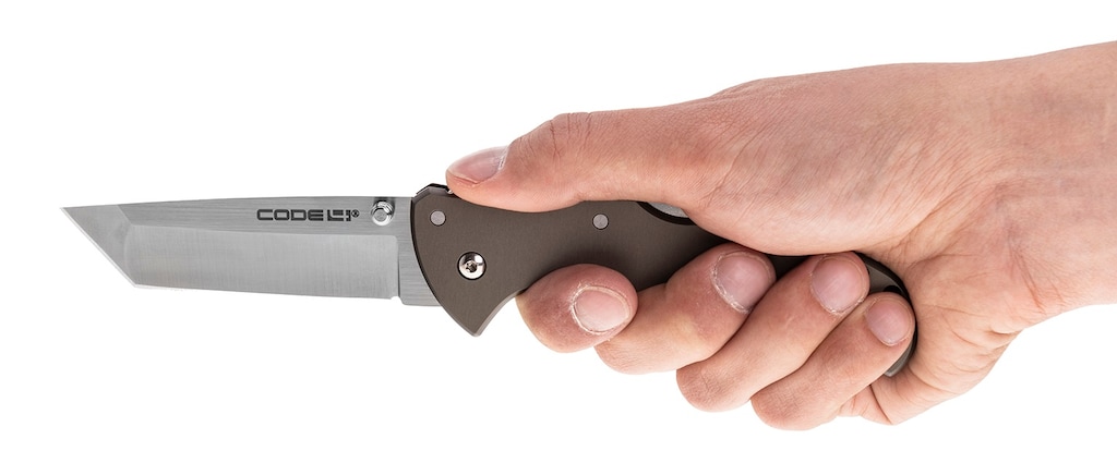 Ергономічно сформована ручка виготовлена з двох алюмінієвих пластин, анодованих у колір Gun Metal Grey. Форма рукоятки запобігає зісковзуванню руки на лезо. Надійність захоплення підвищує насічка під великий палець на обусі рукоятки. Зручне повсякденне носіння забезпечує переставний пружинний кліпс на рукоятці, що дозволяє зачепити ніж за кромку кишені або елементи спорядження. Крім того, модель Code 4 має на задній частині рукоятки отвір, через який можна протягнути шнур для захисту від втрати.