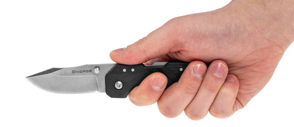 Складаний ніж EDC (Every Day Carry) з серії Engage, оснащений клинком з профілем Clip-Point, виготовленим з нержавіючої сталі 4116SS, яка відзначається легкістю заточування. Лезо оброблено за методом Stonewash, що підвищує стійкість до подряпин і усуває відблиски. Ніж відкривається за допомогою обостороннього штифта під великий палець. Клинок блокується ковзним механізмом Atlas Lock, запатентованим Cold Steel. Ручка чорного кольору виготовлена з нейлону, армованого скловолокном (GFN), що забезпечує протиковзке захоплення. Зручне, повсякденне перенесення забезпечує пружинний кліпс.