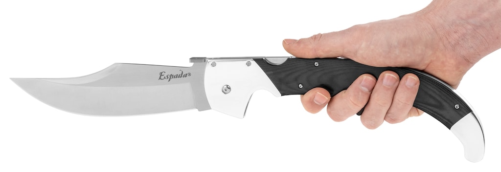 Складаний ніж з лінії Espada XL з клинком з профілем Clip-Point виведеним пустотілим шліфуванням, яке забезпечує високі ріжучі властивості. Лезо оброблено методом сатинування. Клинок виготовлений з нержавіючої сталі S35VN, яка характеризується стійкістю до зносу та корозії. Ручка чорного кольору виготовлена з ламінату G10 з протиковзкою текстурою. Ніж відкривається за допомогою обостороннього диску під великий палець, а блокіровка Tri-Ad Lock забезпечує безпеку використання.