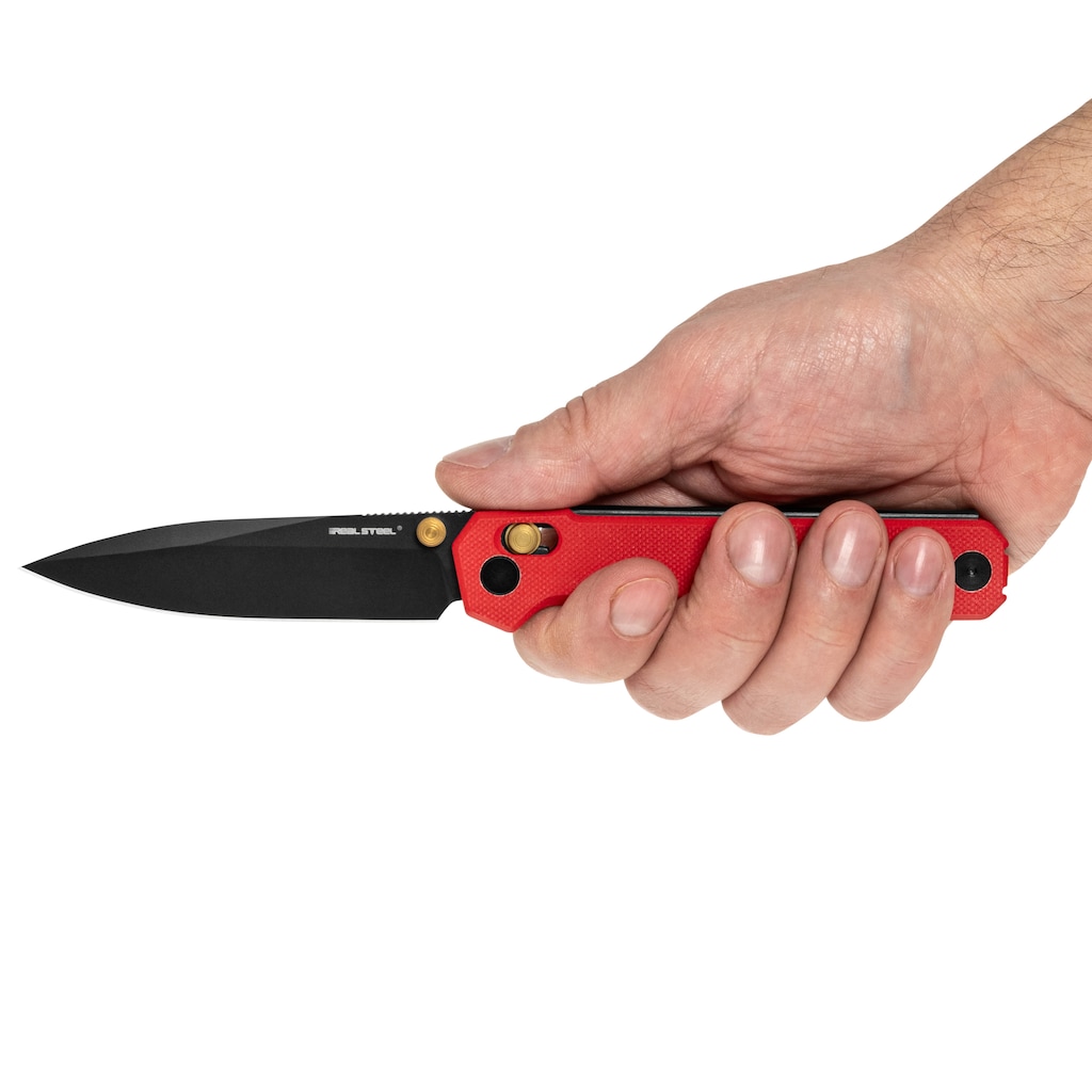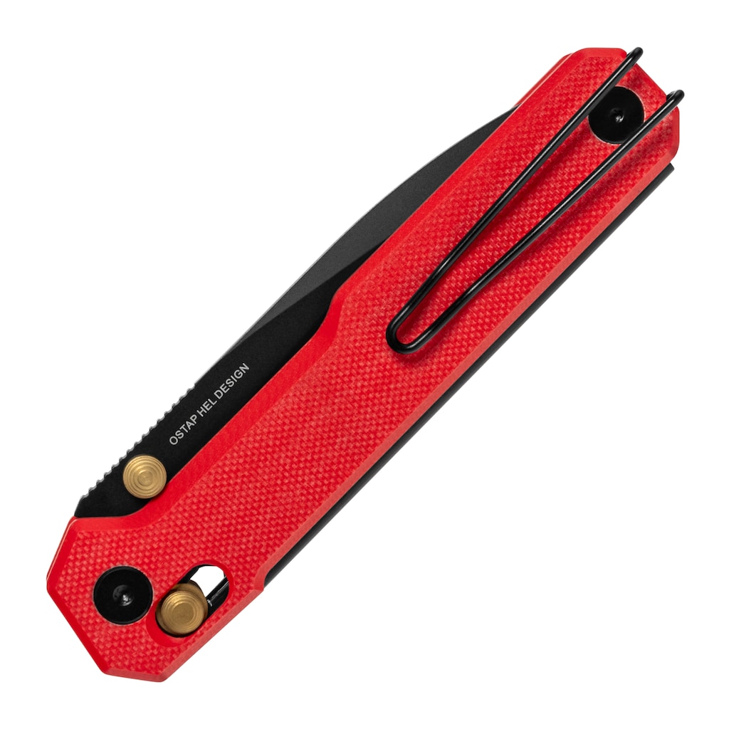 Облицювання рукоятки виконано з ламінату G10 червоного кольору. Використаний матеріал характеризується низькою вагою при збереженні високої стійкості до пошкоджень, вологи, зміни температури, а також більшості розчинників і кислот. Ергономічна форма облицювань в поєднанні з їх текстурованою поверхнею забезпечує надійний і безпечний хват. Зручне носіння забезпечує пружинна кліпса типу deep-carry (tip-up, right carry), що дозволяє легко прикріпити ніж до ременя або краю кишені.