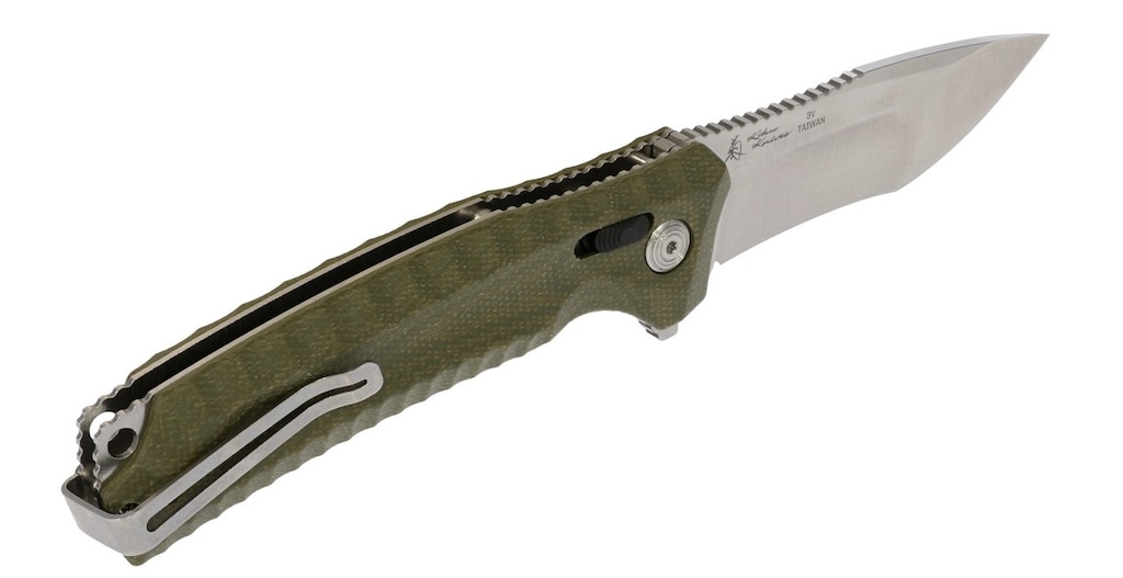 Клинок з гладким ріжучим краєм і довжиною 101 мм виготовлено з високоякісної інструментальної сталі CPM-3V. Використаний матеріал характеризується дуже хорошою стійкістю до затуплення. Лезо оброблено покриттям Satin, яке надає йому ефект неточного полірування та ефективно маскує можливі подряпини або подряпини, що виникають під час експлуатації.