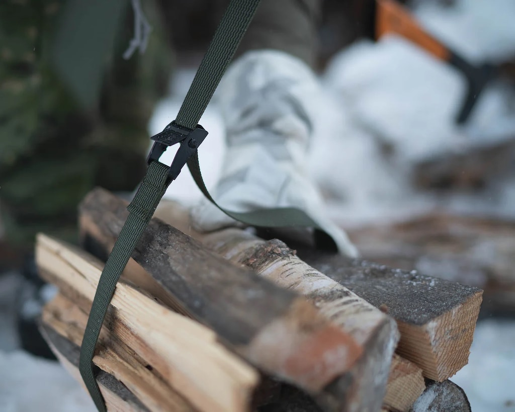 Стропи виготовлені з міцної поліестерової тканини, завдяки чому вони стійкі до стирання та пошкоджень. Стрічки повністю регулюються та застібаються за допомогою стійкої до пошкоджень металевої затискної пряжки, що дозволяє швидко пристосувати та надійно закріпити спорядження.