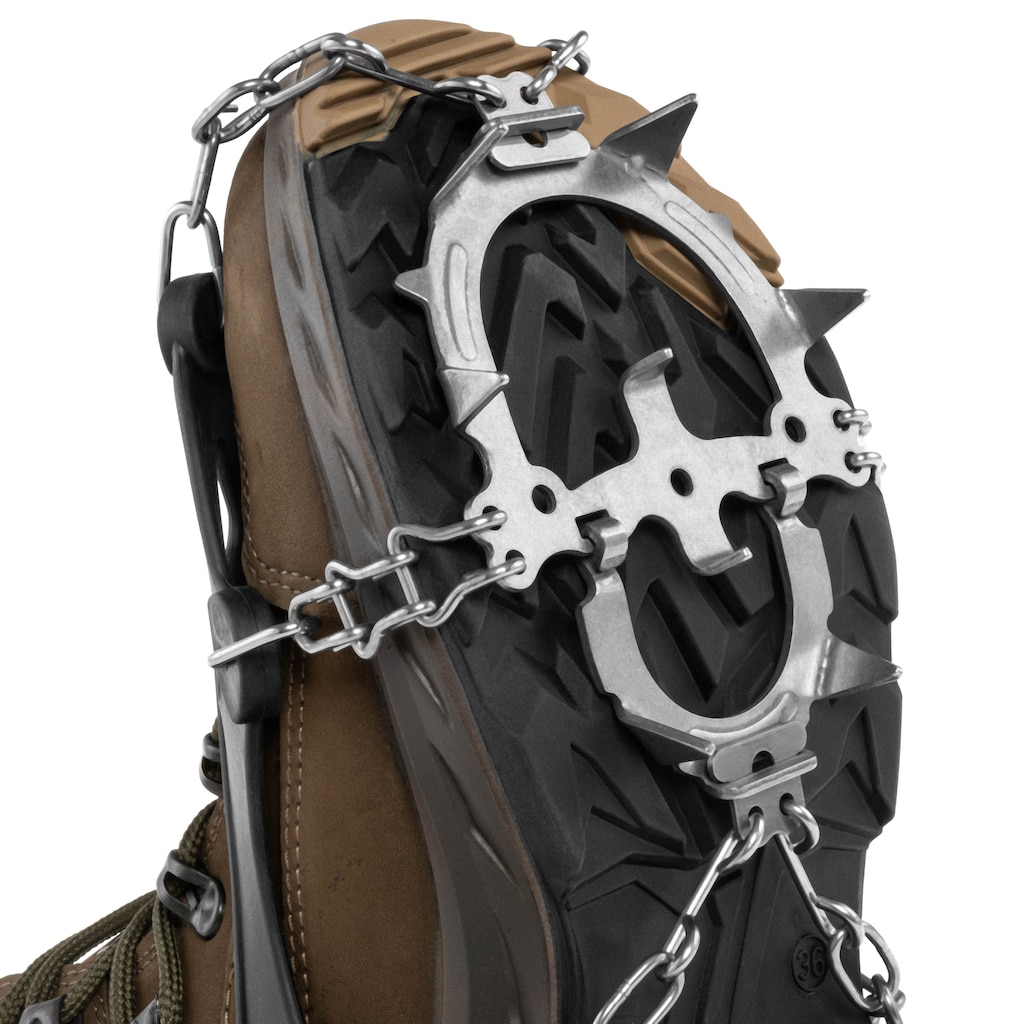 Модель оснащена 12 зубцями, виготовленими з нержавіючої сталі, стійкої до корозії. Зубці з’єднані сталевими ланцюгами, що забезпечує стабільність на слизькій поверхні. Посилення у вигляді сталевих пластин, розміщених у передній та задній частині підошви, збільшує надійність конструкції. Шарнір у передній пластині дозволяє природне згинання стопи, зменшуючи напругу під час ходьби.