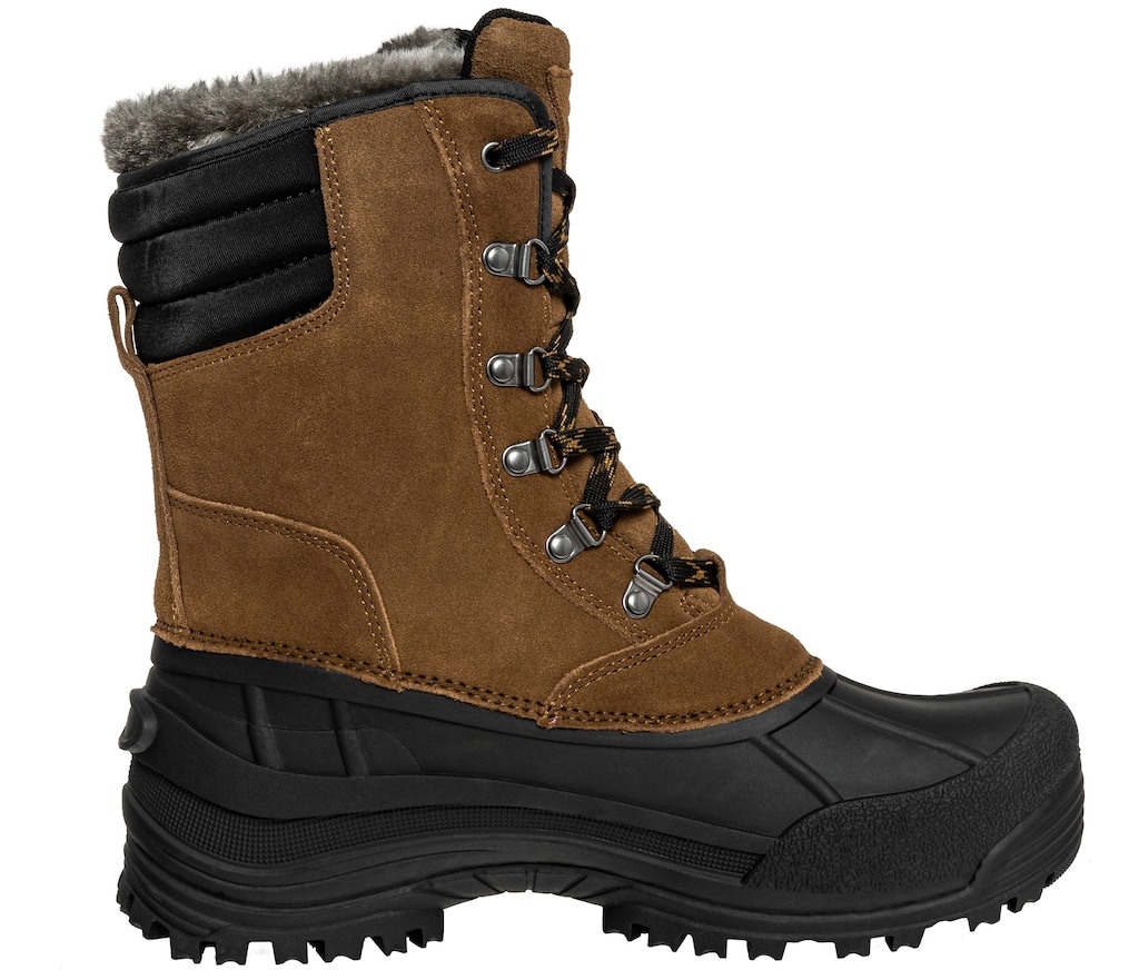 Зимові черевики коричневого кольору, виготовлені з поєднання замшу та синтетичного матеріалу. Оснащені водонепроникною мембраною Clima Protect та теплою підкладкою з вовни та поліестеру, вони зберігають тепло та сухість в зимових умовах. Підошва з гуми TPR забезпечує стабільність та зчеплення на слизькій поверхні.